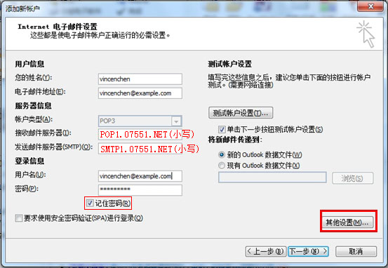 其中,接收郵件服務器是pop1.07551.net和發送郵件服務器smtp1.07551.net。填寫完后,點擊“其他設置”。